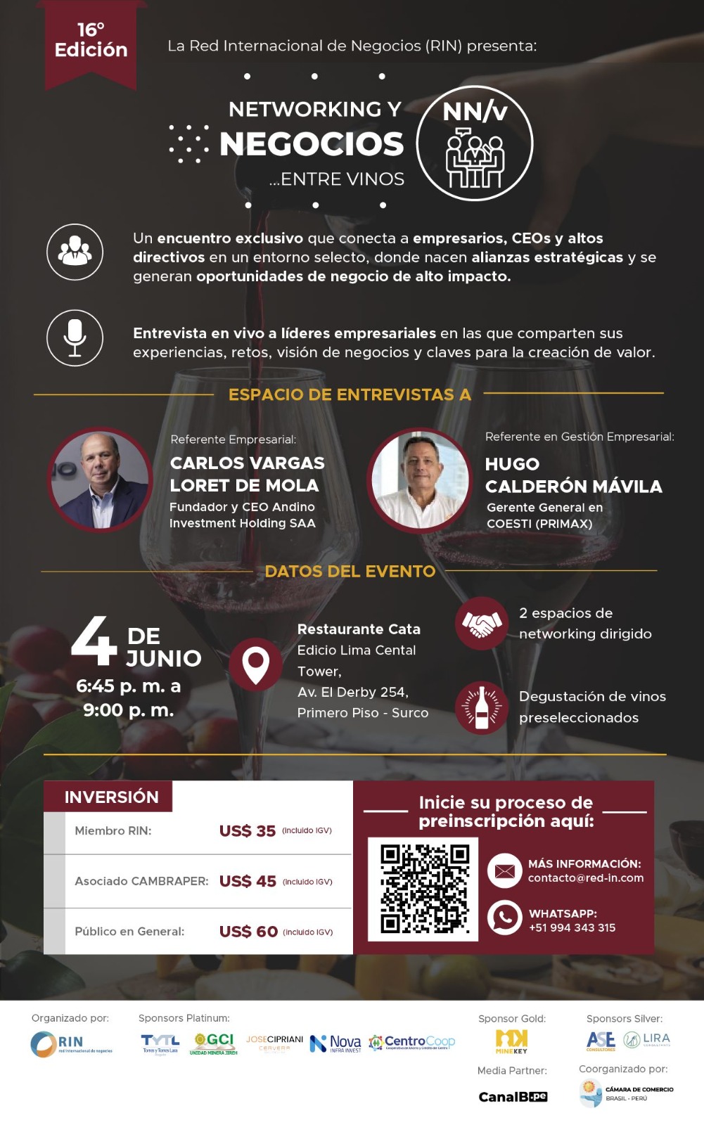 La Red Internacional de Negocios anunció la realización de la 16.ª edición de su encuentro “Networking y Negocios entre vinos”, un evento que convocará a empresarios, ejecutivos y profesionales el próximo 4 de junio en la ciudad de Lima. La cita busca consolidarse como un espacio clave para generar conexiones estratégicas y socializar tendencias del entorno corporativo.