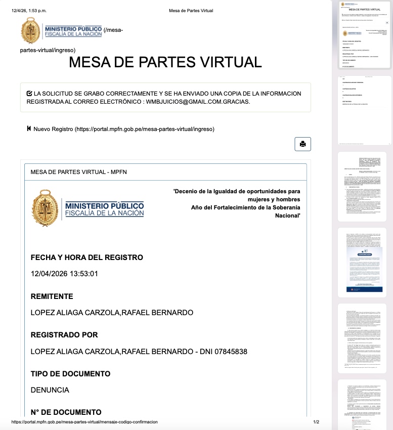 La denuncia fue ingresada a través de la mesa de partes virtual del Ministerio Público y solicita la detención inmediata del funcionario, así como la intervención de la Fiscalía de la Nación.