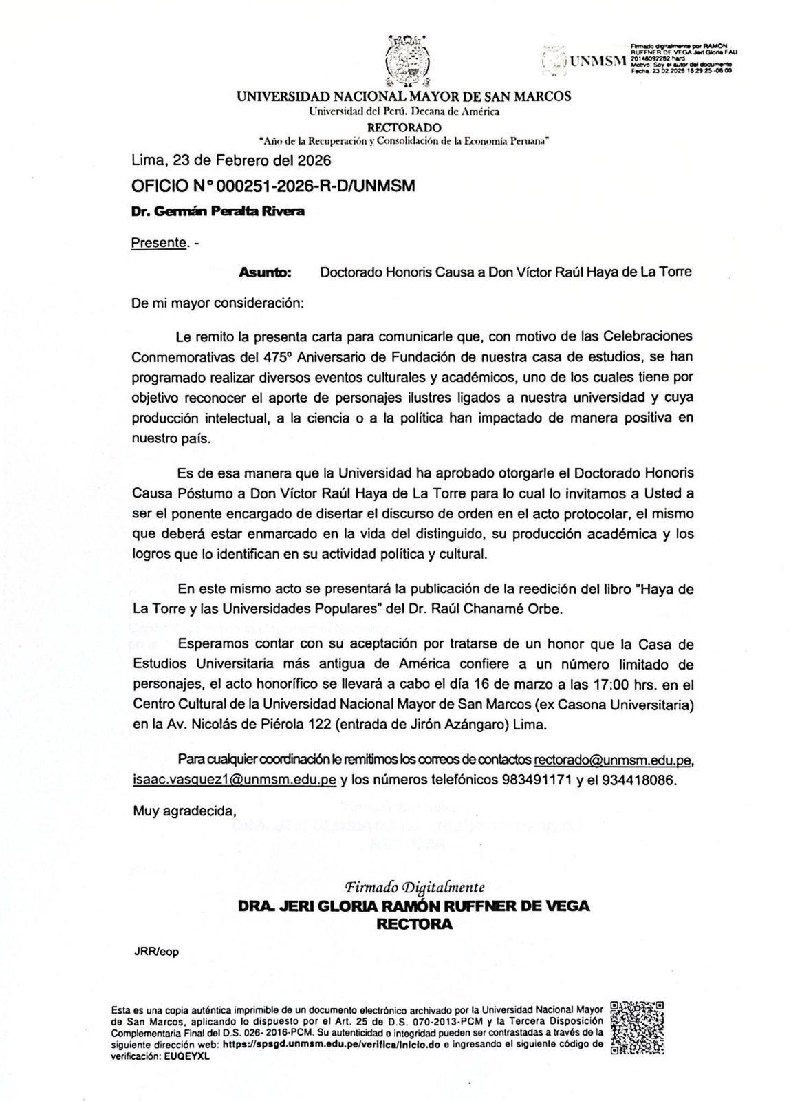 El documento está suscrito digitalmente por la rectora, Dra. Jeri Gloria Ramón Ruffner de Vega, quien expresa su expectativa de contar con la aceptación del invitado para esta ceremonia que, según precisa, constituye un honor reservado a un número limitado de personalidades por parte de la universidad más antigua de América.