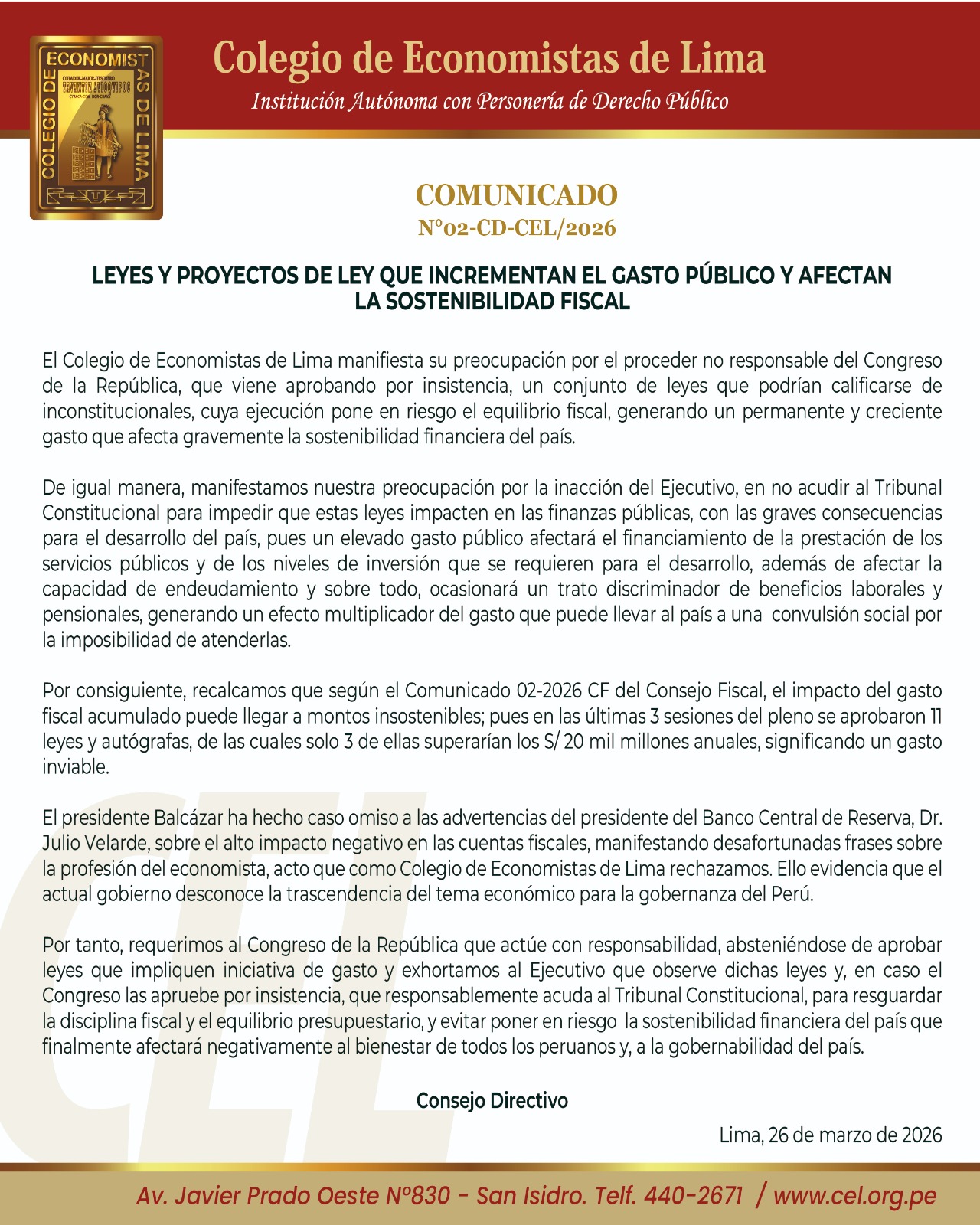 El gremio de economistas también cuestionó la inacción del Poder Ejecutivo al no recurrir al Tribunal Constitucional del Perú para frenar iniciativas que podrían ser inconstitucionales. A su juicio, permitir la entrada en vigencia de estas leyes agravaría el problema fiscal, afectando el financiamiento de servicios públicos, la inversión estatal y la capacidad de endeudamiento del país.