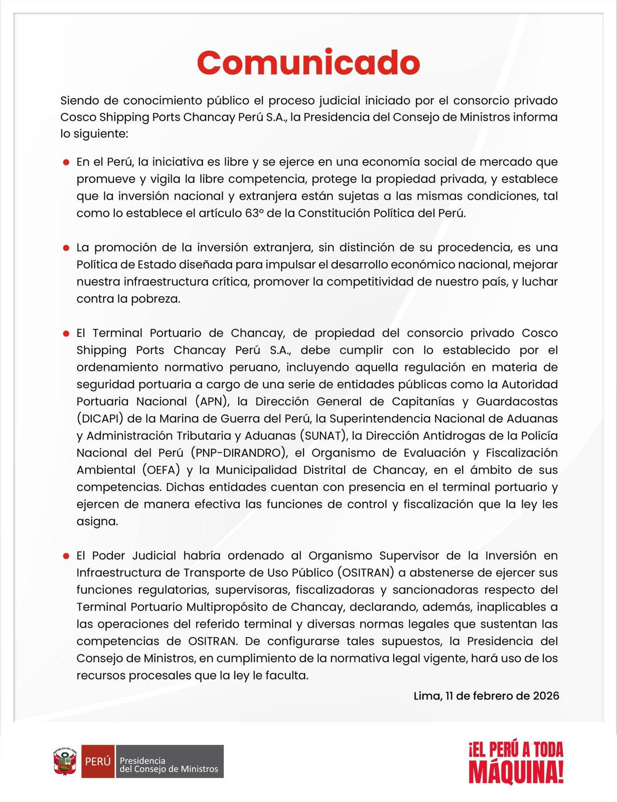 La Presidencia del Consejo de Ministros (PCM) emitió un comunicado en el que se pronuncia sobre el proceso judicial iniciado por el consorcio privado Cosco Shipping Ports Chancay Perú S.A., en relación con las competencias de supervisión del Estado en el Terminal Portuario de Chancay. El Ejecutivo señaló que la inversión privada en el país se desarrolla dentro de una economía social de mercado y bajo el marco constitucional vigente.