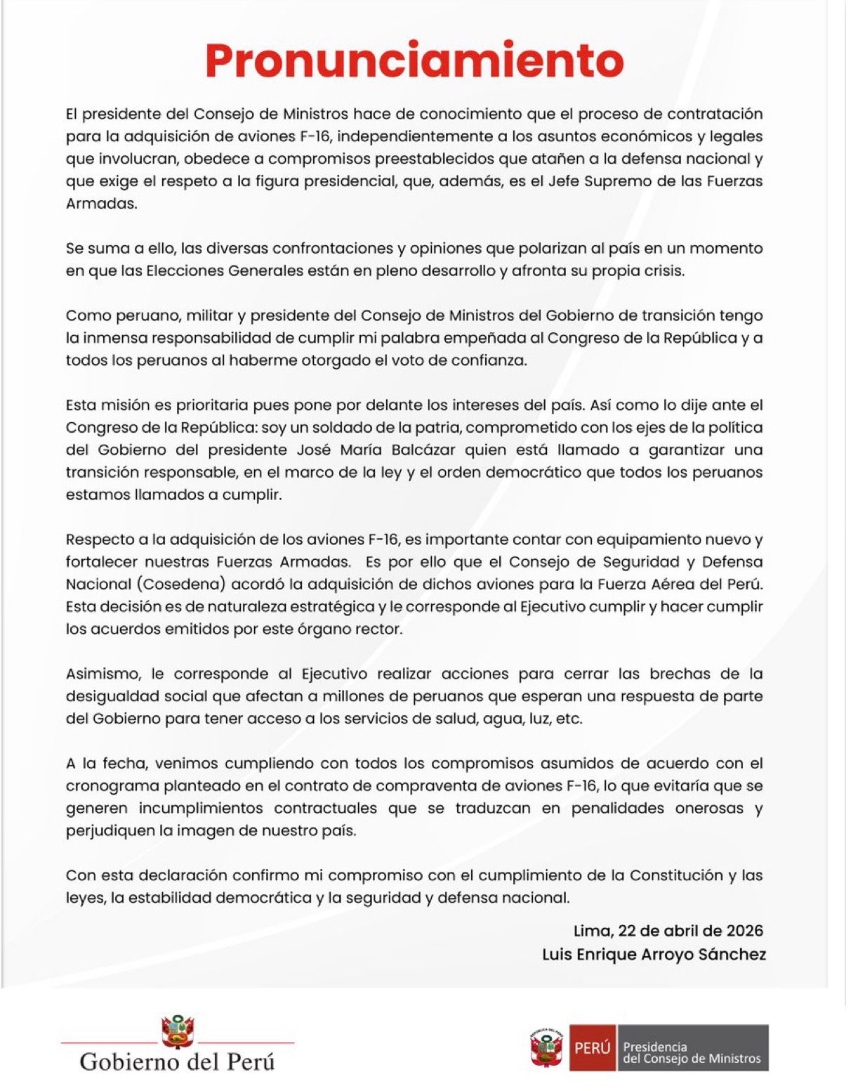 La Presidencia del Consejo de Ministros (PCM), a través de su titular Luis Arroyo Sánchez, emitió un pronunciamiento sobre el proceso de adquisición de aviones F-16 Fighting Falcon, en medio de la controversia política generada en torno a esta operación. El documento subraya que se trata de un proceso vinculado a compromisos preestablecidos en materia de defensa nacional.